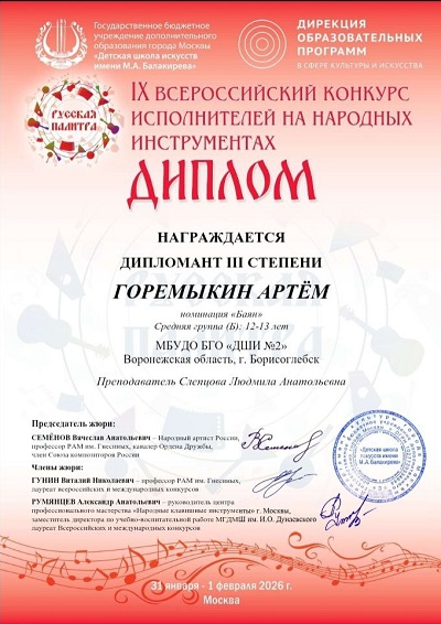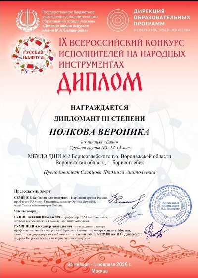 | Учащиеся нашей школы выступили на IX Всероссийском конкурсе юных исполнителей на народных инструментах «Русская палитра» |   В период с 31 января по 1 февраля 2026 года в Москве состоялся IX Всероссийский конкурс юных исполнителей на народных инструментах «Русская палитра», который проходил на базе ДШИ им. М.А. Балакирева. Конкурс объединил огромное количество участников из разных уголков нашей страны. Так, например, показать своё исполнительское мастерство приехали участники из Москвы, Санкт-Петербурга, Воронежа, Тулы, Нижнего Новгорода, Казани, Брянска, Уссурийска, Смоленска, Краснодара и других городов России. Борисоглебск на этом престижном конкурсе представили ученики «Детской школы искусств № 2» – Полкова Вероника и Горемыкин Артём. По решению компетентного жюри юные исполнители были удостоены следующих наград: Полкова Вероника – Дипломант III степени (класс преподавателя Слепцовой Л.А.); Горемыкин Артём – Дипломант III степени (класс преподавателя Слепцовой Л.А.). Поздравляем ребят с победами в конкурсе и желаем не останавливаться на достигнутом! | Пятница 06 Февраль 2026 - 13:08:28 | |