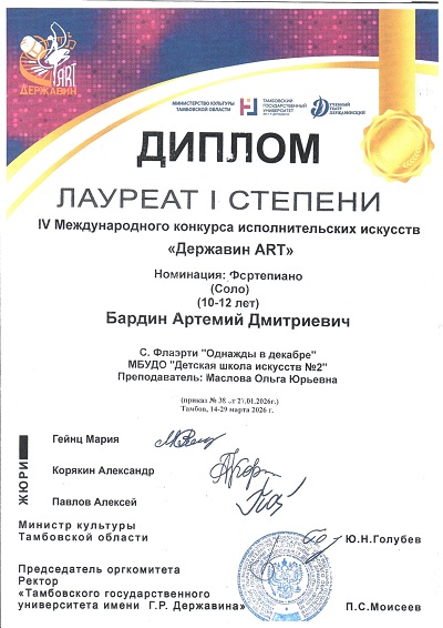 Поздравляем Бардина Артемия (класс преподавателя Масловой О. Ю.) с победой в IV Международном конкурсе исполнительских искусств "Державин Art" состоявшемся в период с 14 по 15 марта 2026 года в Тамбове! По решению компетентного жюри за исполнение музыкальной композиции С. Флаэрти "Однажды в декабре" юный пианист был удостоен диплома Лауреата I степени.