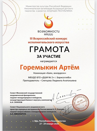 | Учащийся нашей школы принял участие в III Всероссийском онлайн-конкурсе исполнительского искусства «Возможности нации» |  Учащийся «Детской школы искусств № 2» Горемыкин Артём (класс преподавателя Слепцовой Л.А.) принял участие в III Всероссийском онлайн-конкурсе исполнительского искусства «Возможности нации». | Четверг 05 Февраль 2026 - 21:50:54 | |