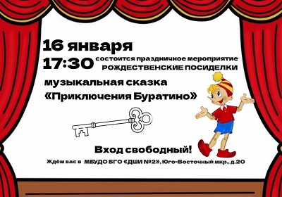 | Музыкальная сказка «Приключения Буратино» |   16 января 2026 года в актовом зале «Детской школы искусств № 2» с большим успехом состоялось праздничное мероприятие «Рождественские посиделки». Учащиеся нашей школы показали для детей и взрослых музыкальную сказку «Приключения Буратино», созданную по мотивам сюжета известной сказки Алексея Толстого "Золотой ключик, или Приключения Буратино", исполнив в спектакле самые разные роли. В ходе театрализованной постановки, режиссёром которой выступила Анна Климова, талантливую игру актёров органично дополняли музыкальные и хореографические номера, подготовленные и исполненные юными артистами под руководством своих преподавателей. Завершением творческого мероприятия стали бурные аплодисменты в адрес юных участников театрального действа, подаренные благодарной публикой за доставленное удовольствие. Больше фото с праздничного мероприятия смотрите, перейдя по ссылке: Фото музыкальной сказки "Приключения Буратино" | Пятница 16 Январь 2026 - 23:14:32 | |